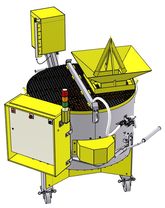 - Tampas que abrem para o centro do tacho, cobertas por chapa expandida que permite visualização do operador às partes internas do tacho. As tampas são monitoradas pelo painel de comando/segurança e que desligam o motor assim que abertas;