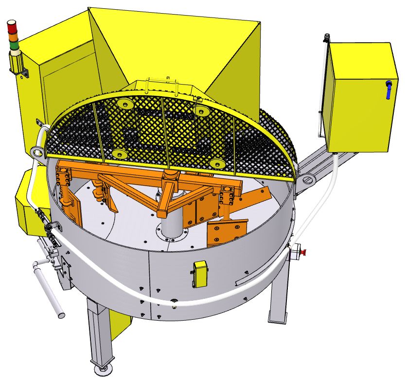 - Tampas que abrem para o centro do tacho, cobertas por chapa expandida que permite visualização do operador às partes internas do tacho. As tampas são monitoradas pelo painel de comando/segurança e que desligam o motor assim que abertas;