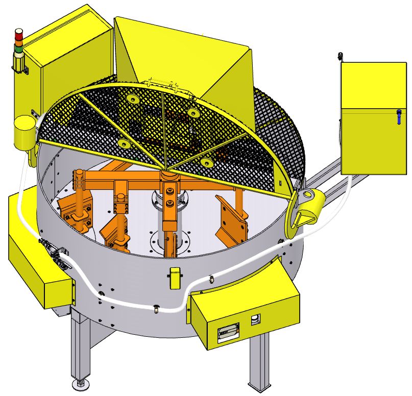 - Tampas que abrem para o centro do tacho, cobertas por chapa expandida que permite visualização do operador às partes internas do tacho. As tampas são monitoradas pelo painel de comando/segurança e que desligam o motor assim que abertas;