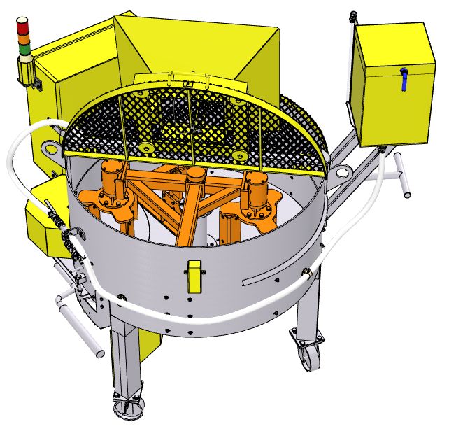 - Tampas que abrem para o centro do tacho, cobertas por chapa expandida que permite visualização do operador às partes internas do tacho. As tampas são monitoradas pelo painel de comando/segurança e que desligam o motor assim que abertas;