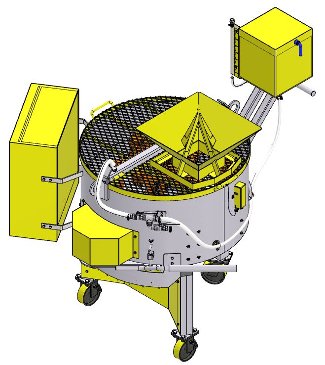 - Tampas que abrem para o centro do tacho, cobertas por chapa expandida que permite visualização do operador às partes internas do tacho. As tampas são monitoradas pelo painel de comando/segurança e que desligam o motor assim que abertas;